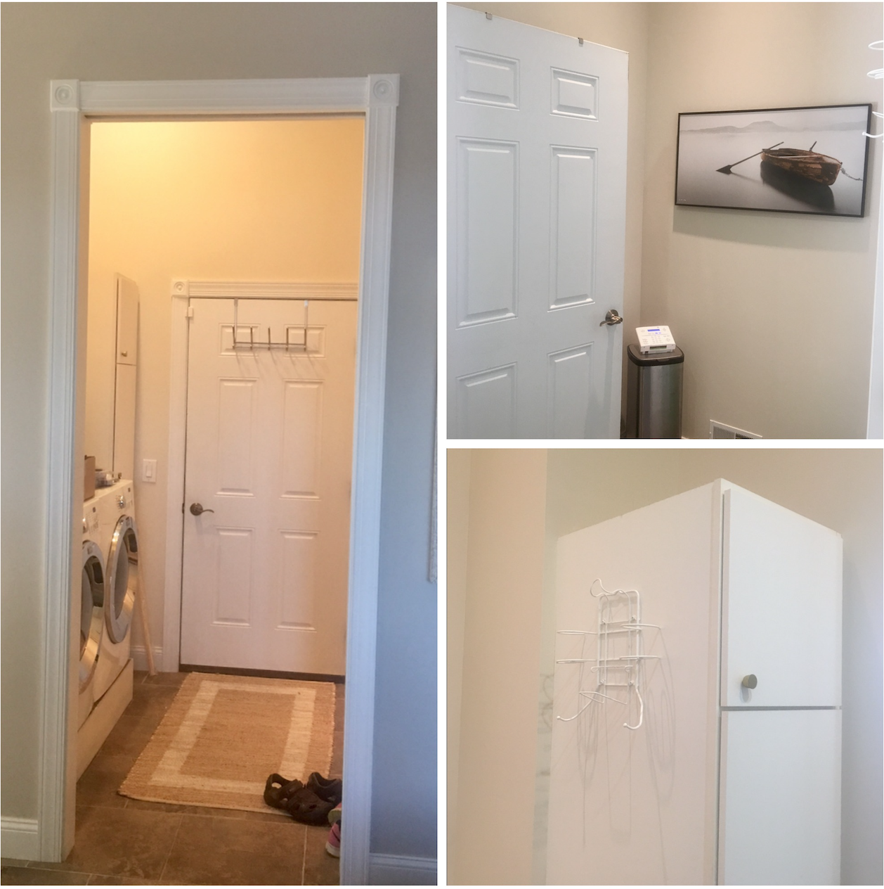 The room I've chosen to makeover is the Laundry/Mudroom at our Lake house. I chose it because after a year of weekends at the house it's become a catch all space that we drop everything as we arrive and there it sits. Maybe it wouldn't be so awful but it's the first space visitors see when they come in. This is our main entrance through the garage. We could of course use the front door but we are casual people and we never use it. So I want the space to be pretty (goes without saying) but also increase the functionality. Here is the plan. Subject to change of course, because that's how I roll. ;)