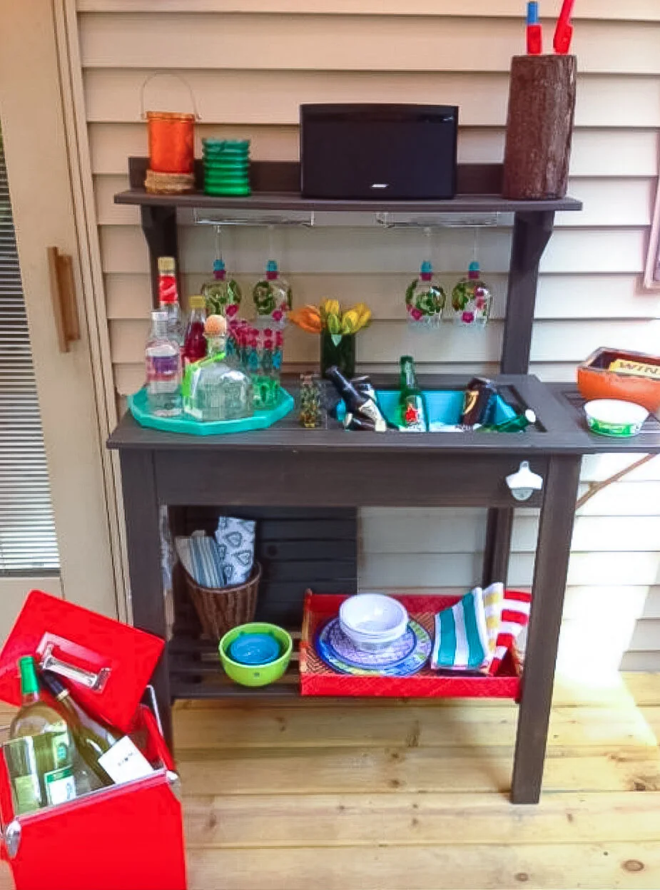 We recently put in a new deck on the back of the house. The difference in the amount of time we spend out there is amazing. I wanted some sort of a bar on the deck for entertaining and remembered seeing a potting bench someone had converted to a bar on Pinterest.